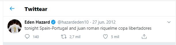 EDEN HAZARD: Su amor nació por Riquelme. El belga siempre le dedicaba posteos en su cuenta de Twitter y cuando se cumplieron 18 años del Topo Gigio en La Bombonera, Hazard convirtió jugando para Chelsea y lo festejó como Román. Después subió las dos fotos y lo calificó como "ídolo". JRR le envió su camiseta, Hazard le agradeció con un video y le mandó la suya.